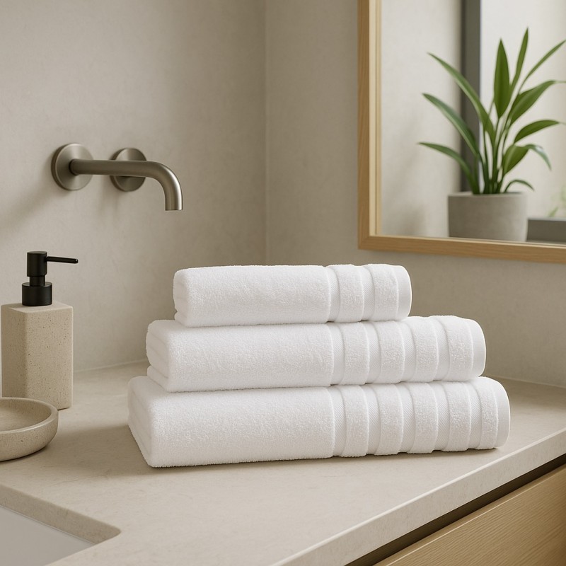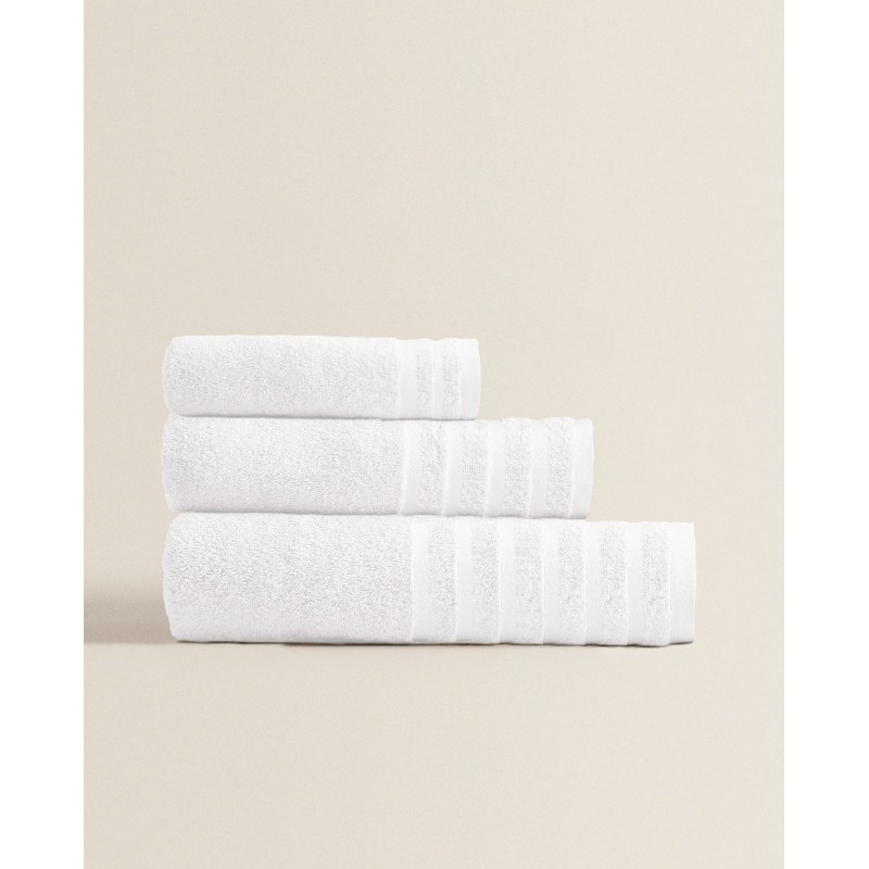 Elegante jogo de banho 3 peças Classic - NAF NAF em branco, ideal para quem procura qualidade, suavidade e um visual moderno. Fabricado em 100% algodão com gramagem 450 g/m², garante elevada absorção, secagem eficiente e um toque confortável sobre a pele.